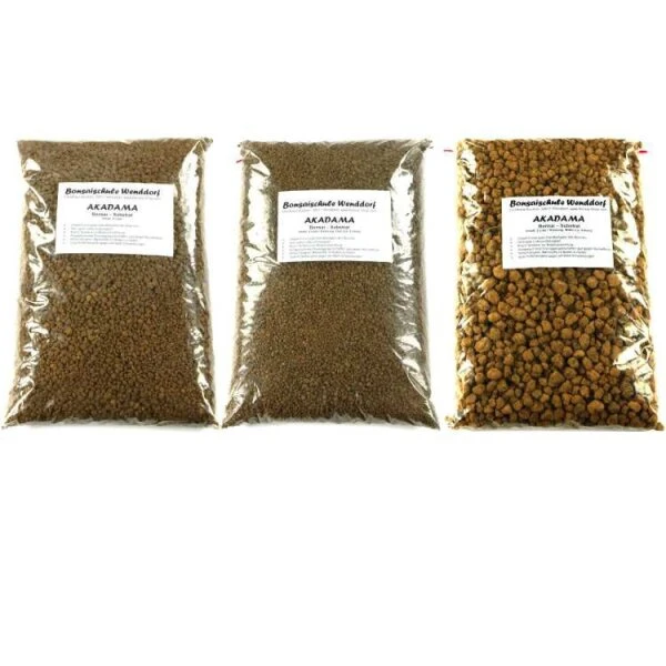 Doppelt gebranntes Akadama in feiner (0-5mm) und mittlerer (4-8mm) Körnung sowie ungesiebt (0-8mm). Inhalt: 3 x 2 Liter.
