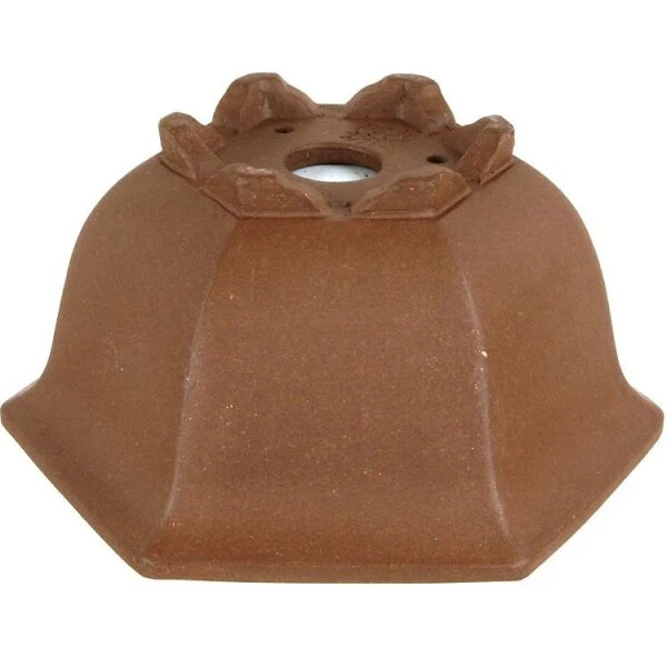 Bonsaischale (Unglasiert, Braun, Sechseckig) in den Abmessungen: 14cm Länge, 12.5cm Breite, 6.8cm Höhe.