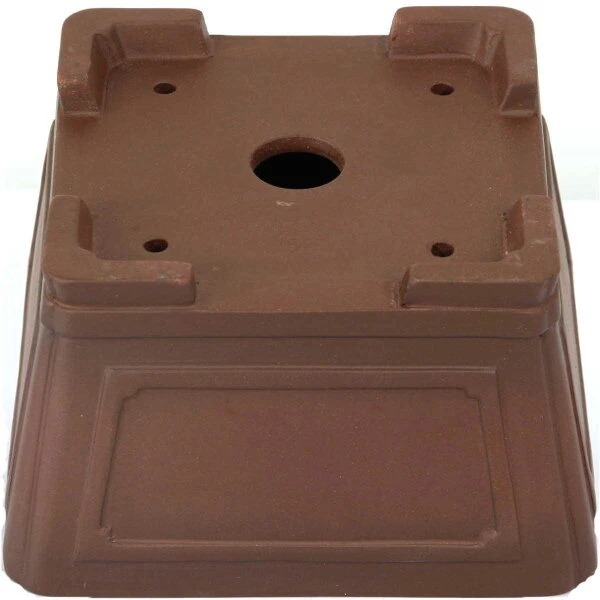 Bonsaischale (unglasiert, antik-braun, quadratisch), handgemacht, in den Abmessungen: 19cm Länge, 19cm Breite, 11.5cm Höhe.