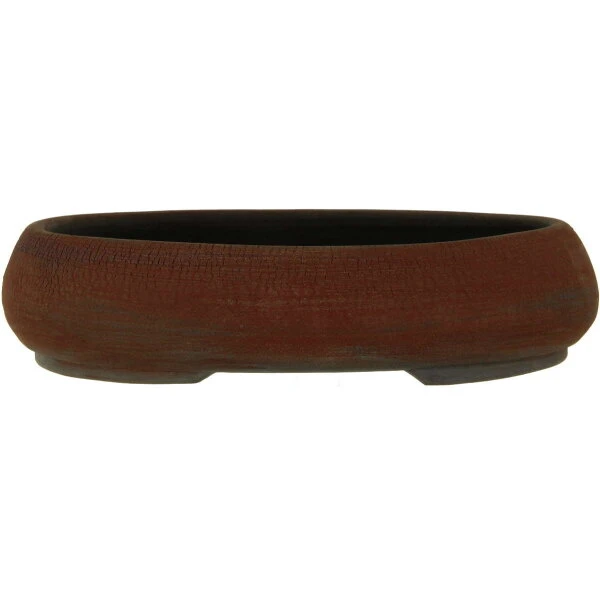 Bonsaischale (Unglasiert, Rotbraun, Oval), handgemacht, in den Abmessungen: 26.5cm Länge, 21cm Breite, 6cm Höhe.