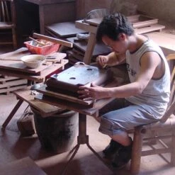 Herstellungsverfahren: Der Aufbau erfolgt mit Tonplatten in einer Gipsform. Der lederharte Rohling wird akurat per Hand geglättet und beim Trocknen ständig ausgerichtet und nachkorrigiert. Anschließend wird die Schale bei ca. 1230°C im Gasofen dichtgebrannt.