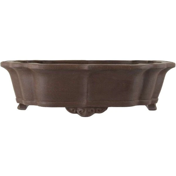 Bonsaischale (Unglasiert, Dunkelbraun, Lotusförmig), handgemacht, in den Abmessungen: 47cm Länge, 37.5cm Breite, 13cm Höhe.