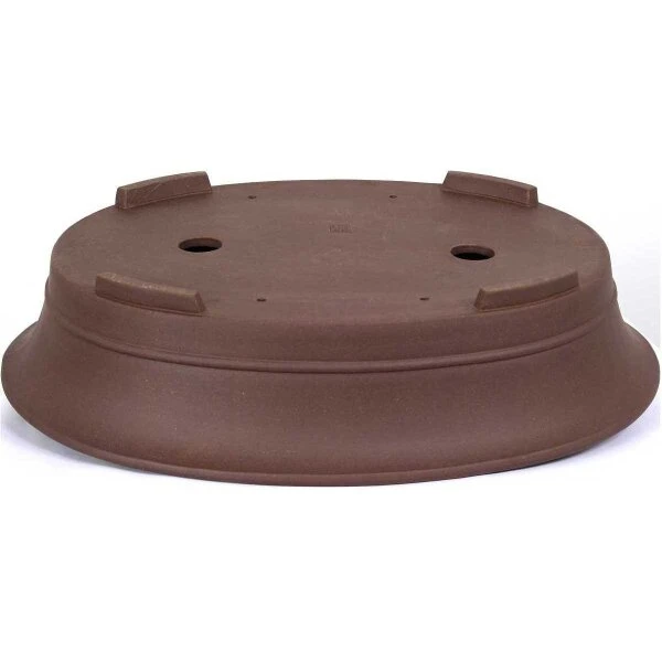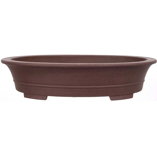Bonsaischale (unglasiert, braun, oval), handgemacht, in den Abmessungen: 60.5cm Länge, 47.5cm Breite, 13.5cm Höhe.