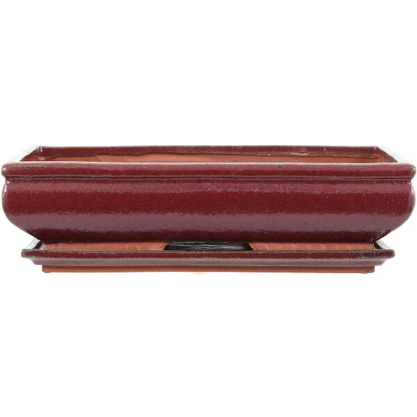 Bonsaischale mit Untersetzer (glasiert, rot, rechteckig) in den Abmessungen: 38.5cm Länge, 24cm Breite, 9cm Höhe. Gute Standardqualität aus der Töpferstadt Yixing.